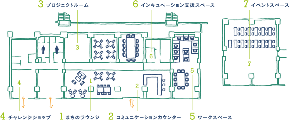 仕事や自習など集中したいときに使えるスペース。創業を目指す人や、起業した人のためのコワーキングスペース、ビジネスマンのセカンドオフィスとして、また自習室としても使用できます。