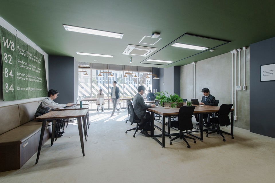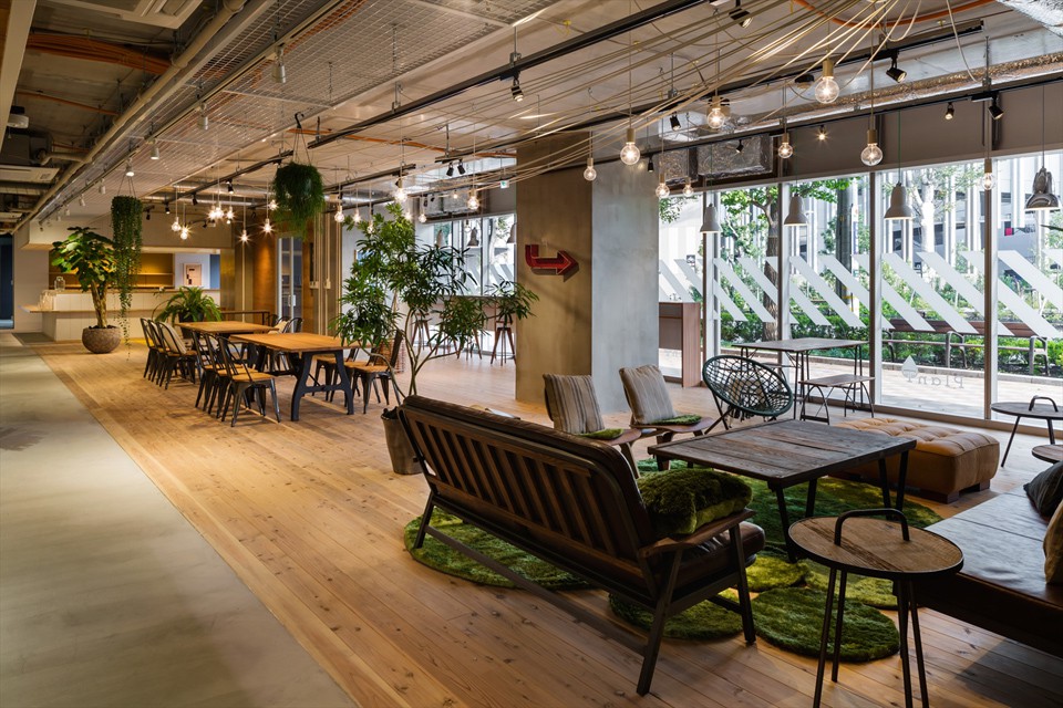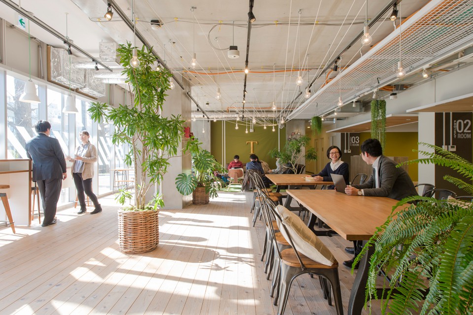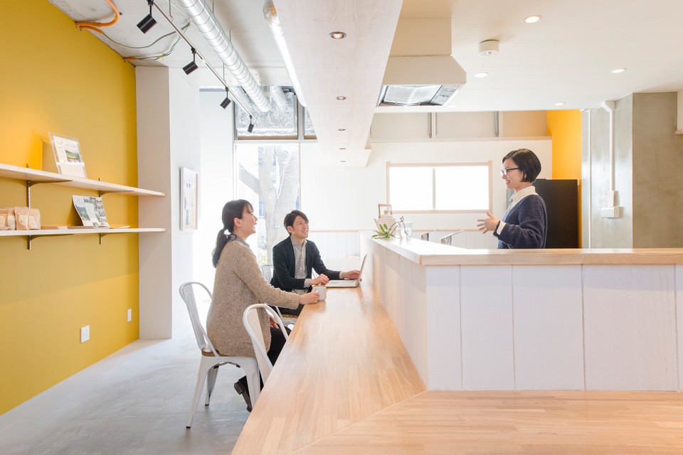 デスク席、ソファ席、カウンターを備えたPlanTの中心スペース。様々な人々が集まり、気分に合わせた席で、勉強や相談、考えごと、コーヒーブレイクなど、思い思いの使い方のできる場所です。