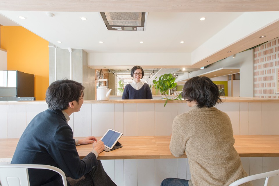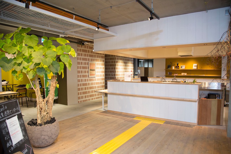施設の受付となるカウンターでは、キッチン機能を兼ね備え、使用者同士、また運営者と使用者のコミュニケーションの場として機能します。